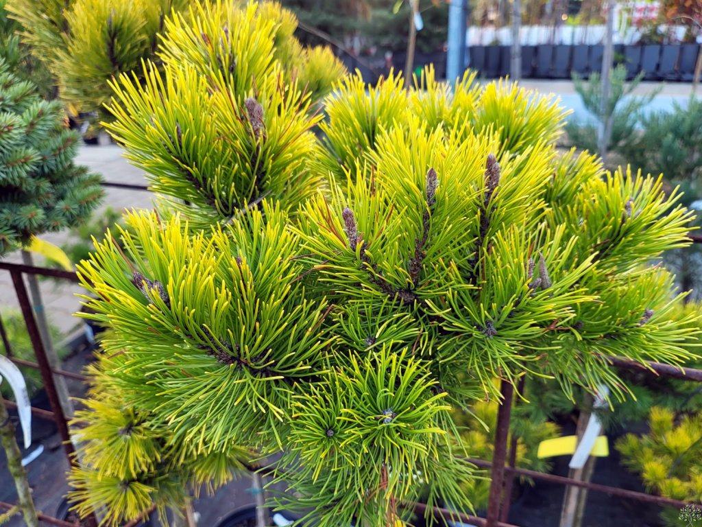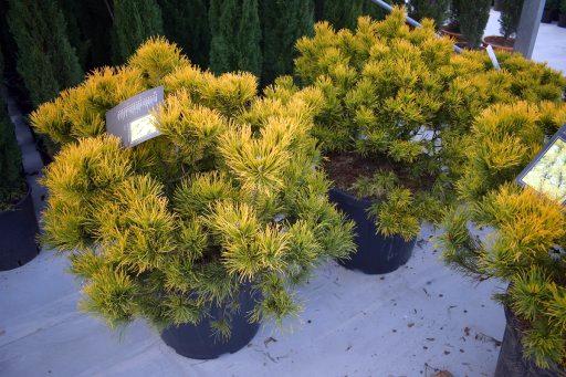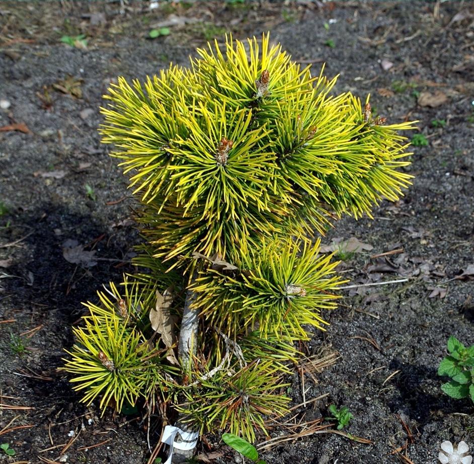 L’une des plus belles variétés de pin nain. Elle se caractérise par une croissance basse et rampante jusqu’à 1 m de haut et des aiguilles inhabituelles. Les longues aiguilles, en groupes de 3 à 7, sont légèrement courbées du côté ensoleillé et droites à l’ombre. Elles ont une belle couleur jaune à leur extrémité. Il est intéressant de noter que cette couleur devient extrêmement intense en automne, alors que la plante devient jaune-vert en été.