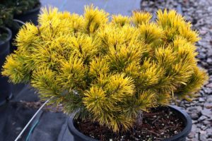 Ne pas confondre avec le pin sylvestre Wintergold plus bas dans cet article. Atteint un mètre de haut et deux mètres de large en 30 ans. En hiver, les aiguilles de ce pin jaunissent naturellement, ce qui donne l’impression d’un bel arbuste doré. Cette couleur dure jusqu’à la fin du printemps. En été, les aiguilles deviennent vertes.