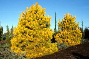 Il s’agit d’une variété naine au port en forme de dôme, qui atteint 40 cm de haut et 70 cm de large en 10 ans. Caractérisée par une coloration panachée des aiguilles, vert clair au printemps et en été, devenant jaune d’or en automne après les premières gelées et conservant cette couleur jusqu’au printemps.